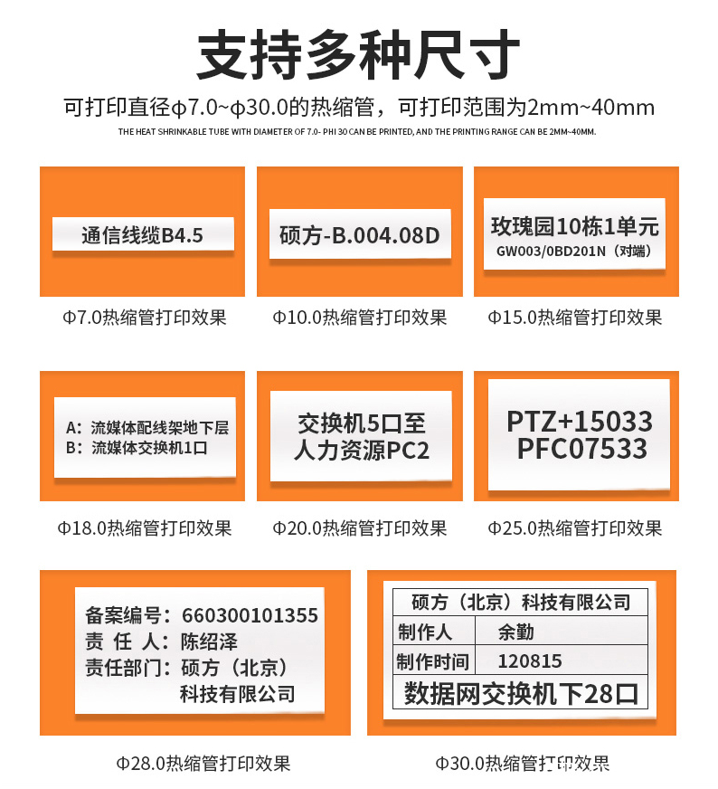 硕方TP2000专注φ7至φ30大号热缩管标号打印,配备高精度打印头,呈现300DPI高精度打印效果,广泛应用于配电开关柜、电信电缆、电力配电站、充电桩电线标识、汽车内部线路防护、制造业线缆分类等多种领域。