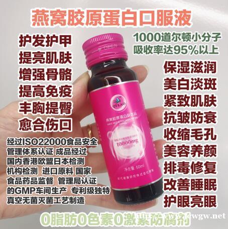 七老燕窝胶原蛋白肽饮品不含任何防腐剂、人工色素、激素等添加剂的,可以直接被人体吸收,不加重身体的吸收负担;还可以促进其他微量元素的吸收;尤其是对孕妇的产后身材和皮肤的恢复有奇效,是准妈妈的首选,我们的产品采用深海鱼皮是最天然的原料,最顶级的生产工艺,无污染、不过敏、无防腐,更是采用国际标准的GMP药品工艺生产流程,比您吃水果、吃鱼还要安全。没有任何副作用和不适反应。每瓶蕴含的鱼胶原蛋白肽粉高达10000mg美容养颜,紧致肌肤,强筋骨骼,滋阴养肺,改善睡眠多重功效,滋养身心。